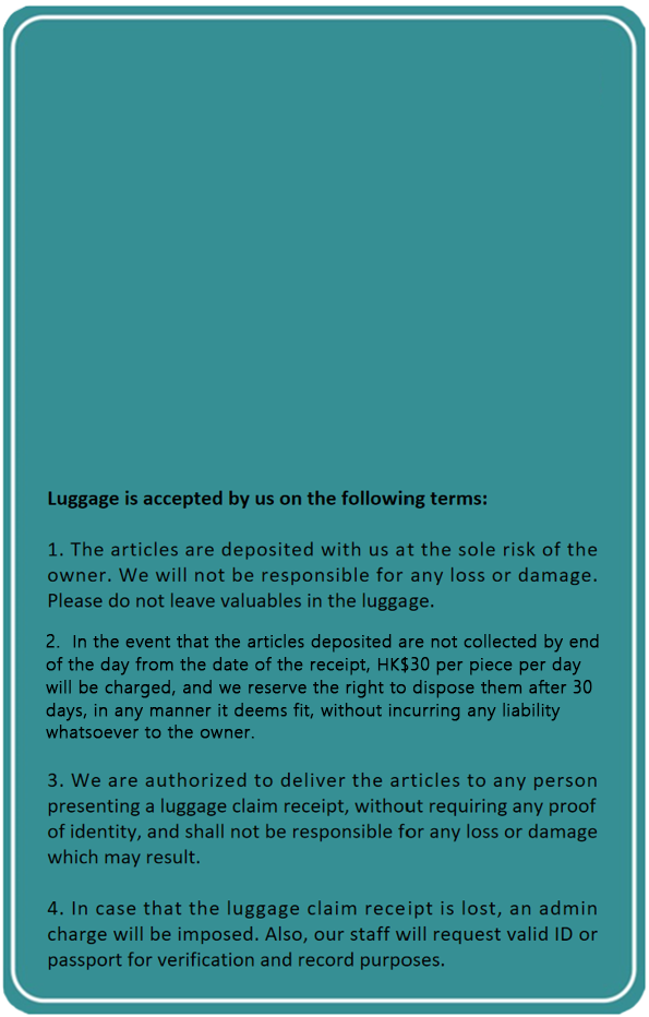 5.9 Members must reclaim their luggage before the time specified in their order bookings. Extra daily charge will incur if the luggage is not reclaim on time.